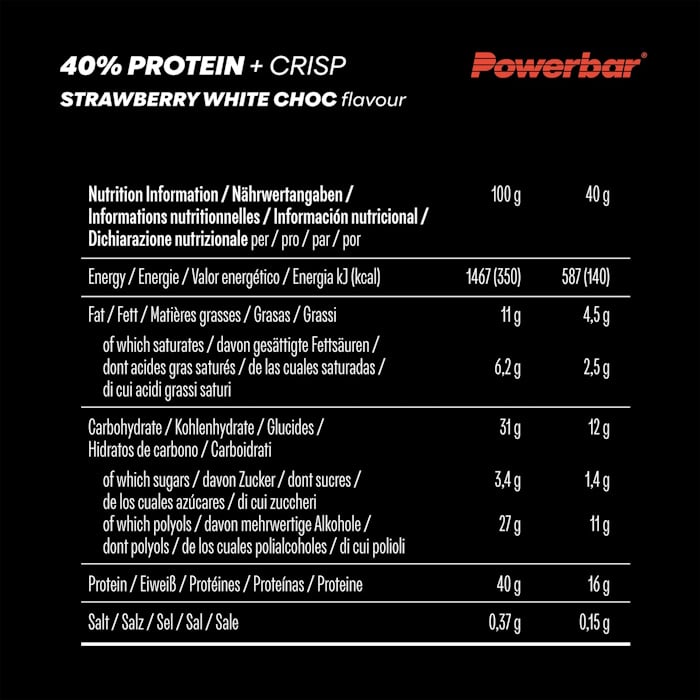 κακάο , πλήρες ΓΑΛΑ σε σκόνη, γαλακτωματοποιητής (λεκιθίνες)], υγραντικά (γλυκερόλη, σορβιτόλες), υδρολυμένο κολλαγόνο, διογκωτικός παράγοντας (πολυδεξτρόζη), νερό, υδρολυμένη πρωτεΐνη ορού γάλακτος ( ΓΑΛΑ ), σοκολάτα ΓΑΛΑΚΤΟΣ χωρίς προσθήκη ζάχαρης με γλυκαντικό [γλυκαντικό (μαλτιτόλες), βούτυρο κακάο , πλήρες ΓΑΛΑ σε σκόνη, κακαόμαζα, λίπος ΒΟΥΤΥΡΟΥ , γαλακτωματοποιητής (λεκιθίνες ( ΣΟΓΙΑ )), αρωματική ύλη], γλυκαντικό (μαλτιτόλες), τραγανά δημητριακά ΣΟΓΙΑΣ (3%) ( πρωτεΐνη ΣΟΓΙΑΣ , άμυλο, αλάτι), ηλιέλαιο, λυοφιλιωμένες φράουλες (1%), βούτυρο καριτέ , συμπύκνωμα χυμού παντζαριού, συμπύκνωμα μήλου, συμπύκνωμα ιβίσκου, φυσικές αρωματικές ύλες, γαλακτωματοποιητής [λεκιθίνες ( ΣΟΓΙΑ )], αλάτι.
